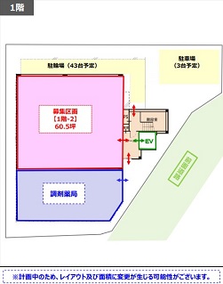 | 面積 | ➀60.5坪(1F)・➁45.7坪(2F)・③45.5坪(2F) ※計画中のため変更になる可能性があります。 |